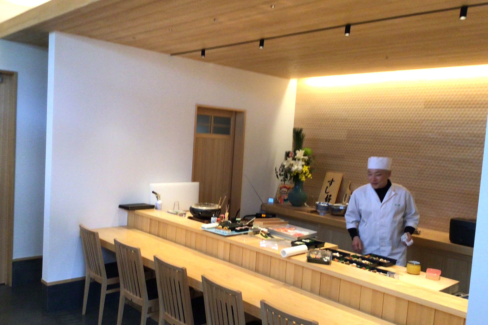 1件目はお寿司屋さんです!内外装にスピンオフを塗り、内装は樅