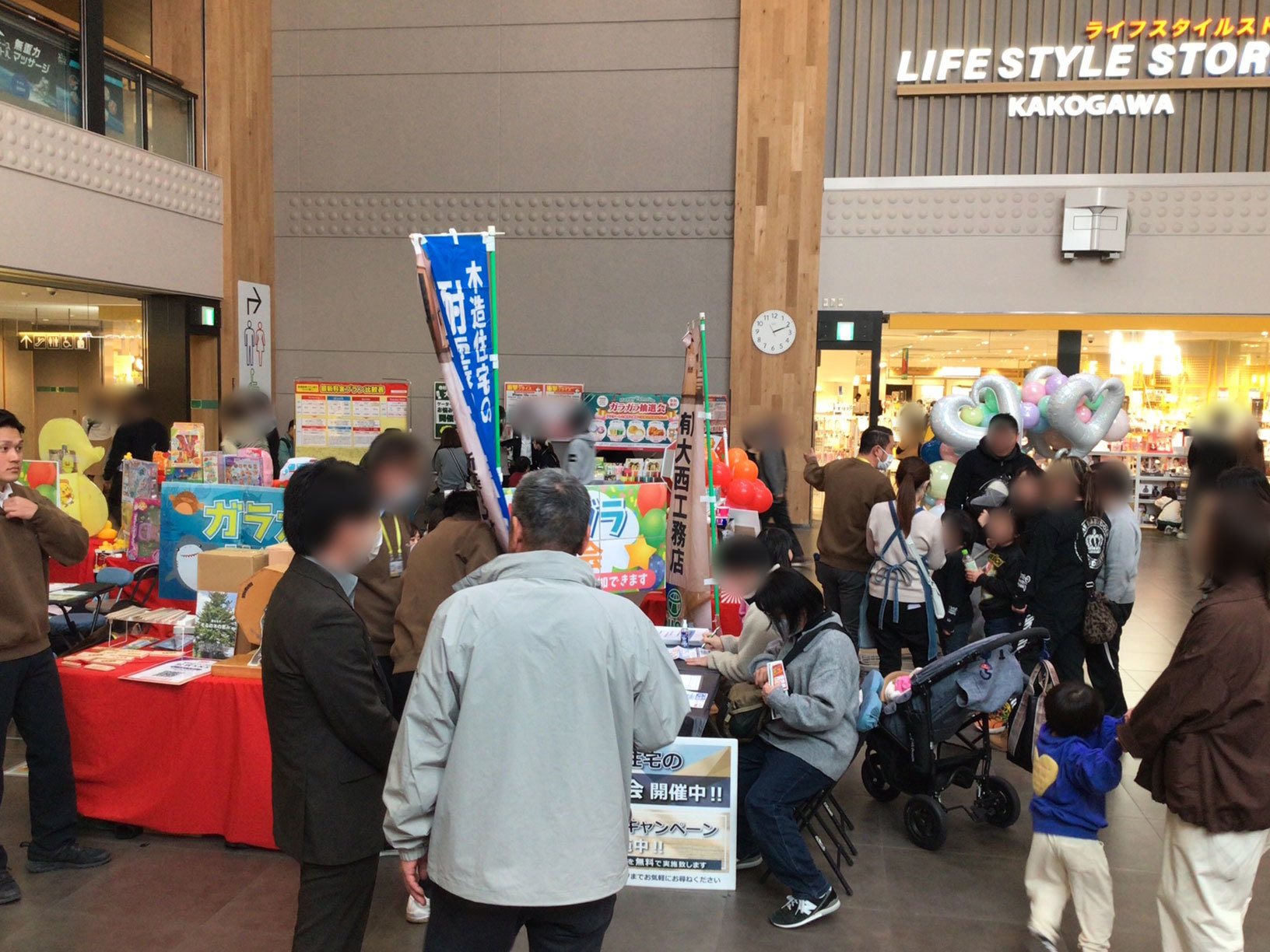 兵庫県 大西工務店様・イベント開催 2026-03-17 今回は兵庫県の大西工務店さんのイベントをアリオ加古川店のセンターホールで行いました! OBさん向けの感謝祭イベントでガラポン抽選も有り、A賞はディズニーの招待チケットです。3日間でたくさんの方に来ていただきありがとうございました!他にも買い物途中のお客様も立ち寄って頂き大西工務店を広く知って頂ける機会だったと思います。 来月は大西工務店さんのモデルでDGHイベントも行いますので興味がある方はご参加ください!よろしくお願いします。